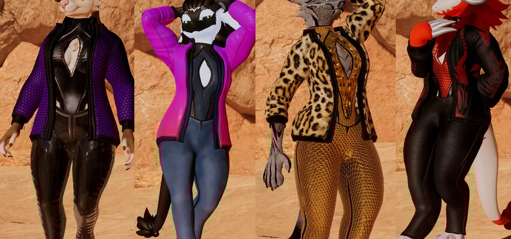 Jacket, Suit, Pants. 5 textures per piece, 15 textures in total. Instructions how to set up. Comes in a unity package.